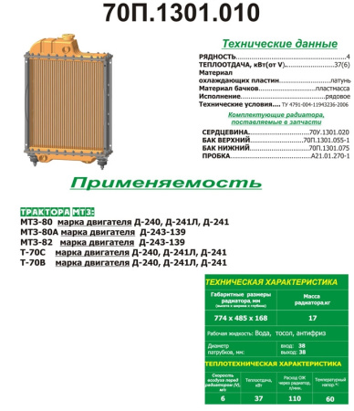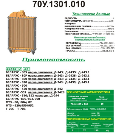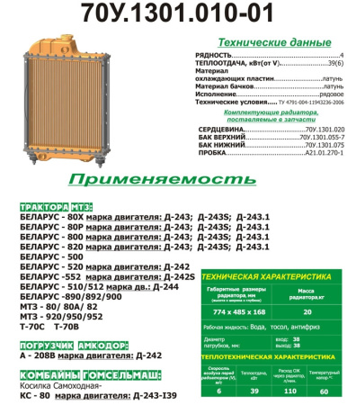 70УМ.1301.010-01 Радиатор водяной МТЗ 4-х рядный (латунные бачки), РФ