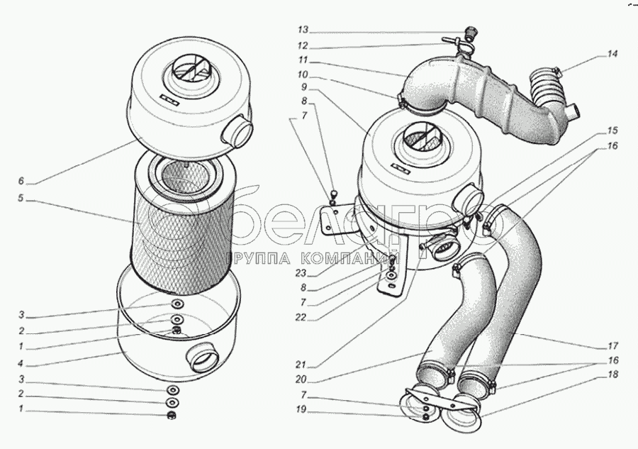 Каталог запасных частей к технике: ГАЗ-560. Фильтр воздушный со шлангами, воздухозаборник