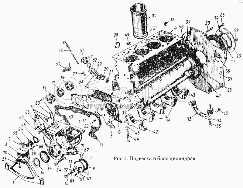 Блок цилиндров (4, 12, 17-19, 28, 32, 37, 38, 40-45, 48, 49)