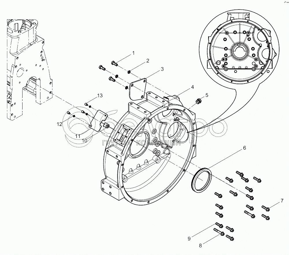 Каталог запасных частей к технике: Weichai 6M11 DHM11D0003. Flywheel Housing Assembly