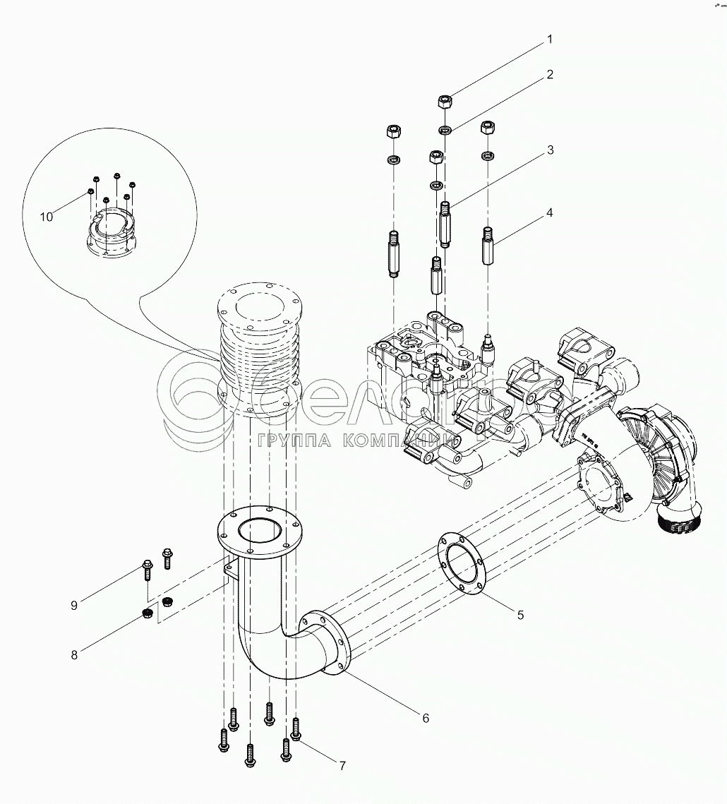 Каталог запасных частей к технике: Weichai 6M11 DHM16D0002. Rear Exhaust Manifold Group
