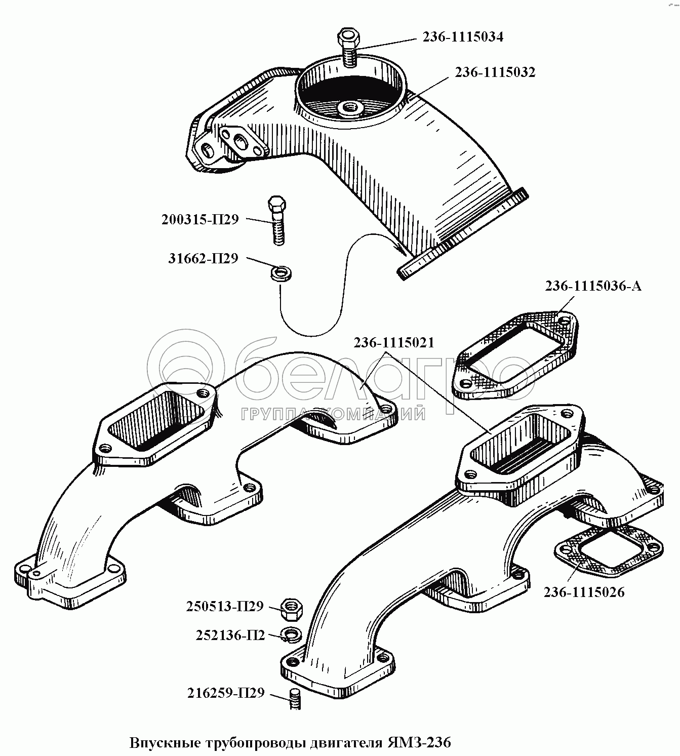 Каталог запасных частей к технике: ЯМЗ-236, -238, -238НБ. Впускные трубопроводы двигателя ЯМЗ-236