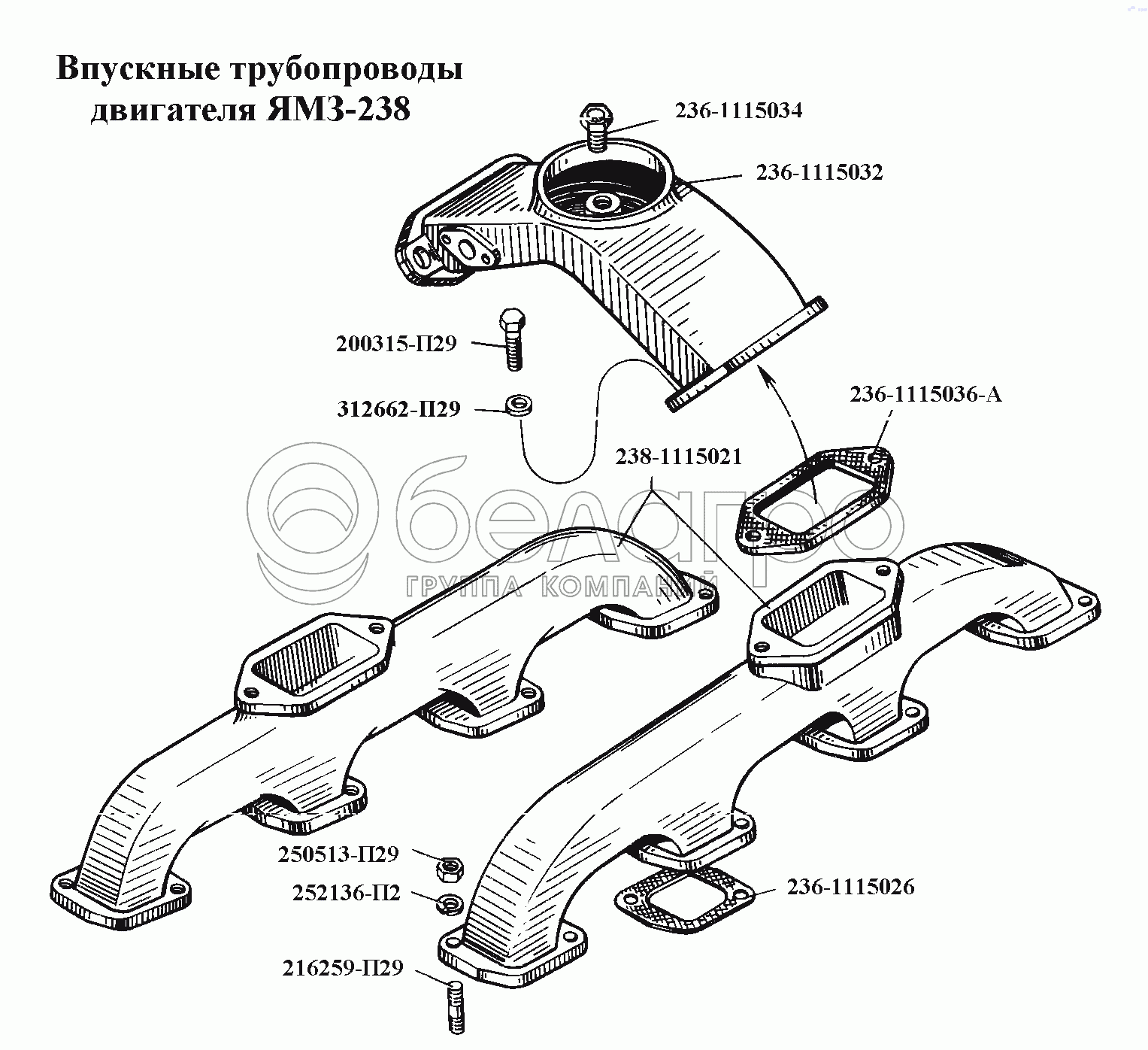 Каталог запасных частей к технике: ЯМЗ-236, -238, -238НБ. Впускные трубопроводы двигателя ЯМЗ-238