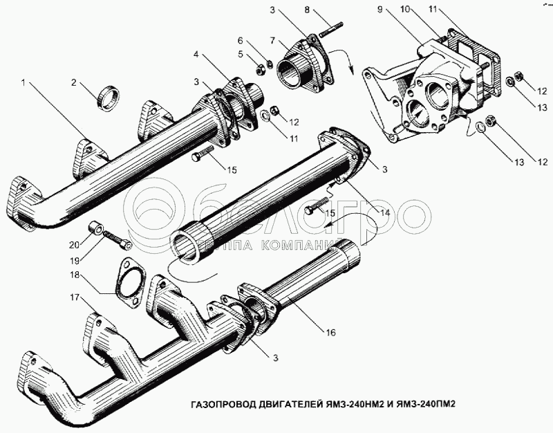 Каталог запасных частей к технике: ЯМЗ-240. Газопровод двигателей ЯМЗ-240НМ2 и ЯМЗ-240ПМ2