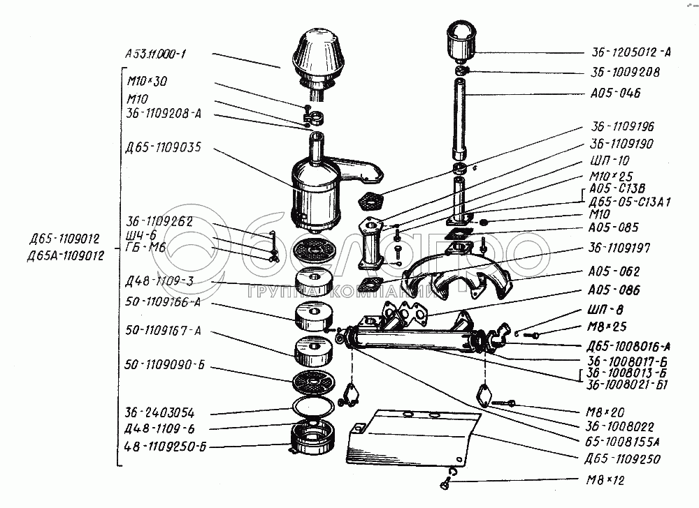 Каталог запасных частей к технике: ЮМЗ Д-65. Газопровод дизеля, фильтр воздушный, искрогаситель