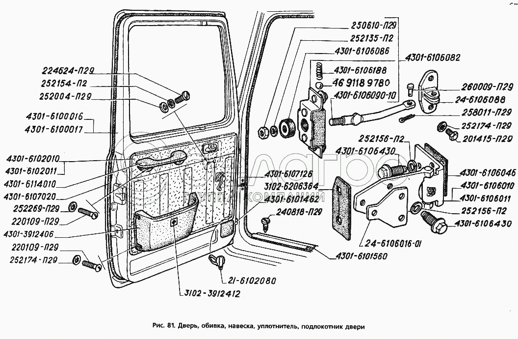 Каталог запасных частей к технике: ГАЗ-3306. Дверь, обивка, навеска, уплотнитель, подлокотник двери