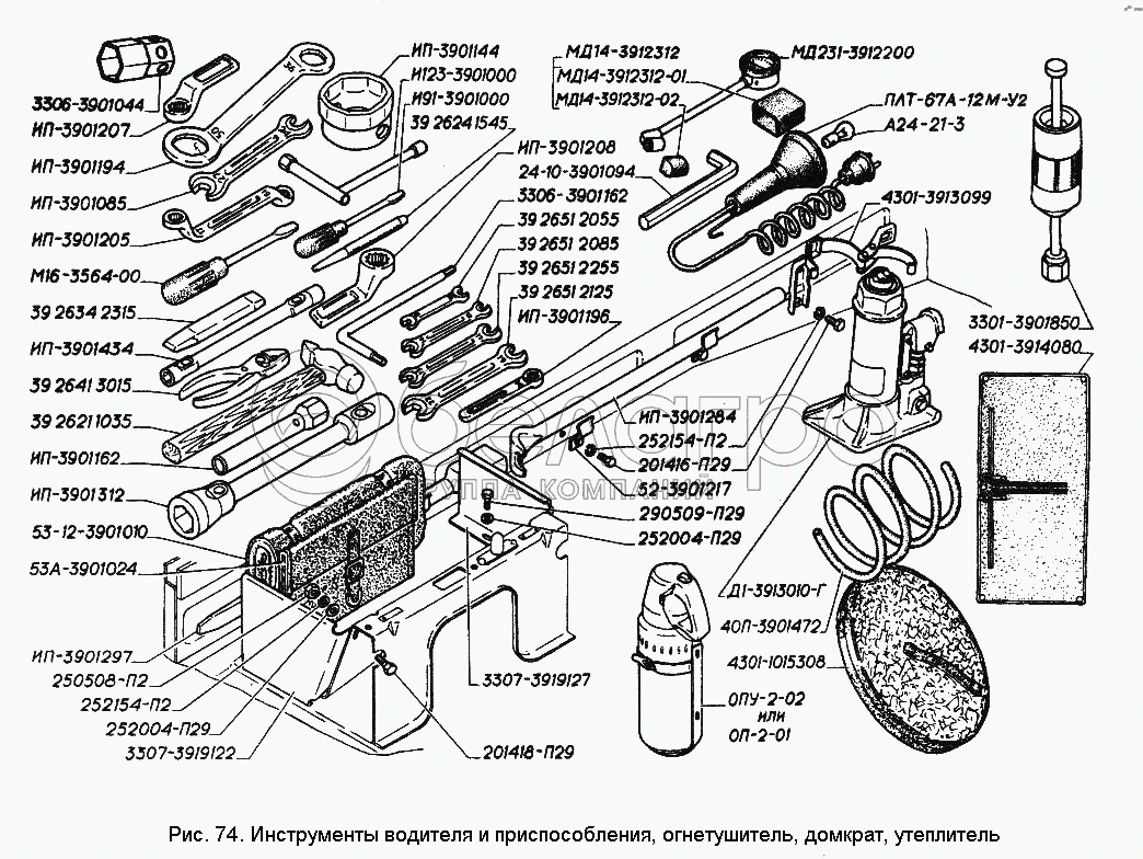 Каталог запасных частей к технике: ГАЗ-3306. Инструмент водителя и приспособления, огнетушитель, домкрат, утеплитель