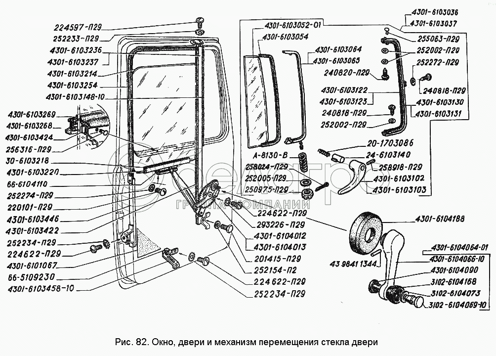 Каталог запасных частей к технике: ГАЗ-3306. Окно двери и механизм перемещения стекла двери