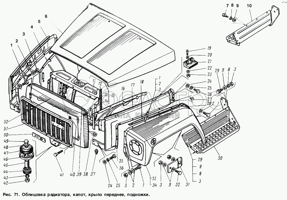 Каталог запасных частей к технике: ГАЗ-3307. Облицовка радиатора, капот, крыло переднее, подножки