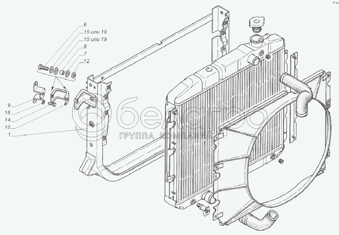 Каталог запасных частей к технике: ГАЗ-33081. 33081-1302003. Установка рамки с радиатором