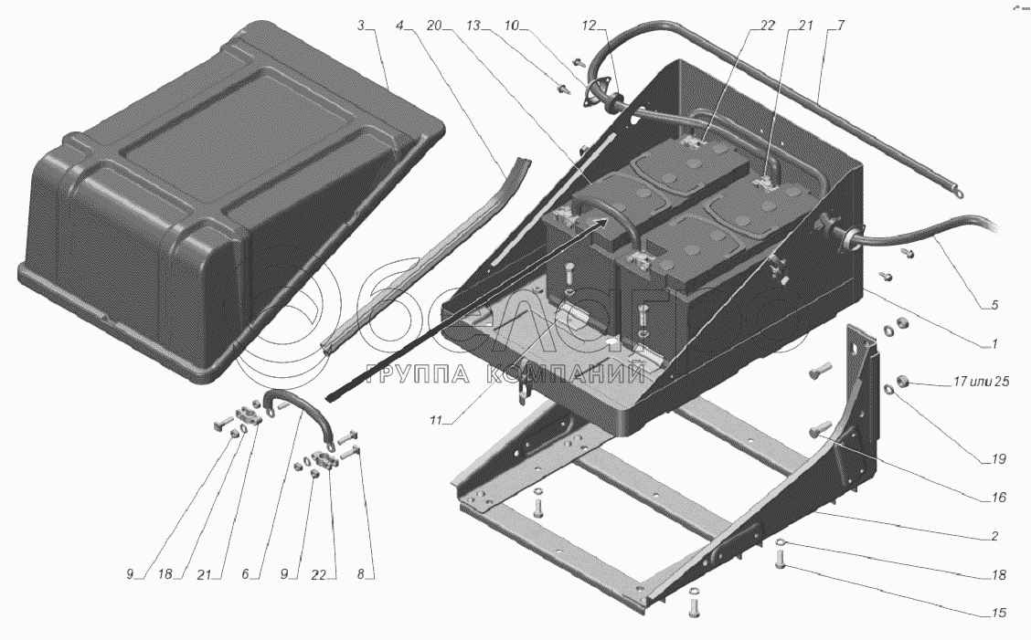 Каталог запасных частей к технике: ГАЗ-33081. 33081-3703001-20. Установка аккумуляторных батарей