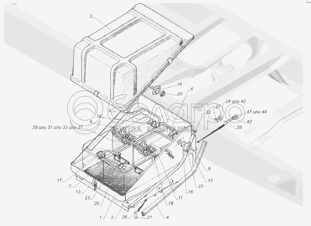 Каталог запасных частей к технике: ГАЗ-33081. 4301-3703001-10. Установка аккумуляторной батареи