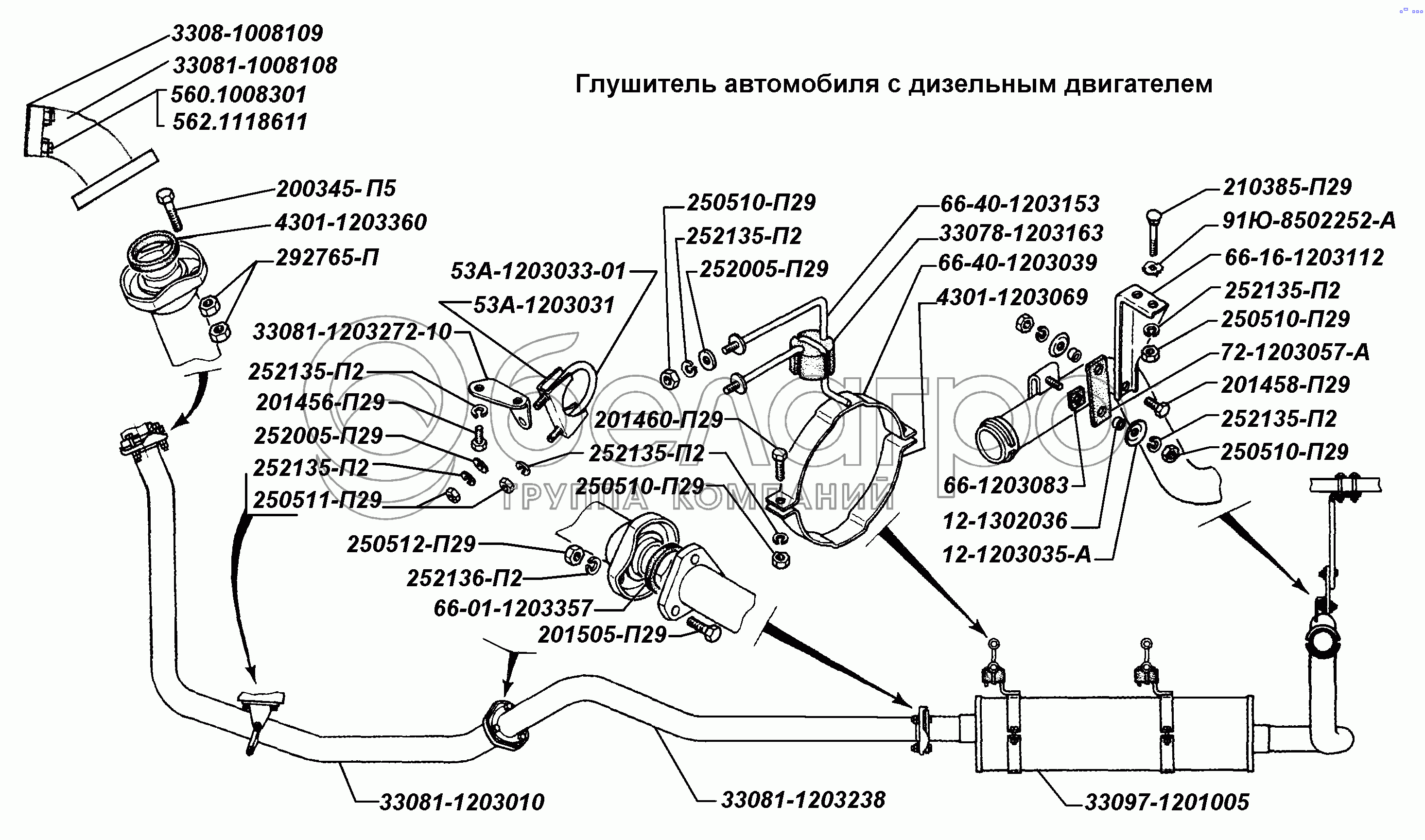 Каталог запасных частей к технике: ГАЗ-3308. Глушитель автомобиля с дизельным двигателем