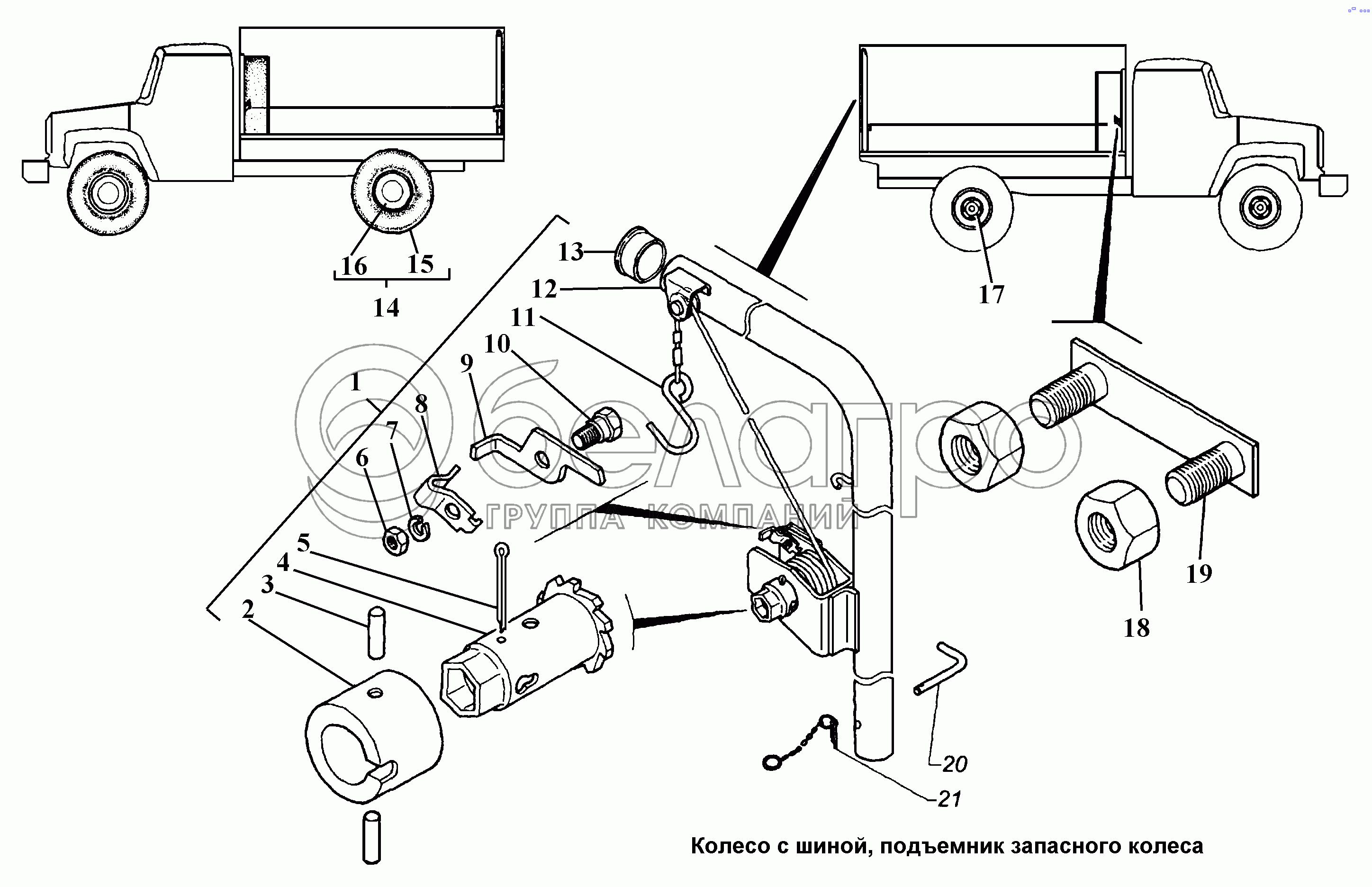 Каталог запасных частей к технике: ГАЗ-3308. Колесо с шиной, подъемник запасного колеса