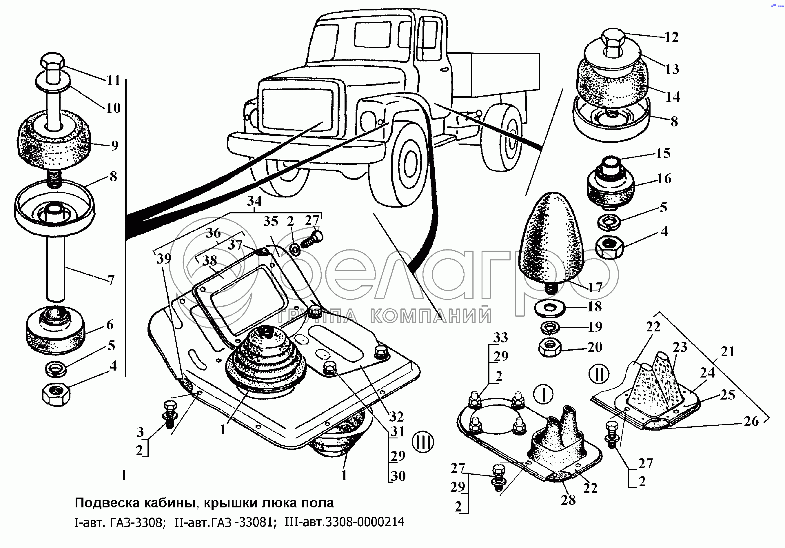 Каталог запасных частей к технике: ГАЗ-3308. Подвеска кабины, крышки люка пола