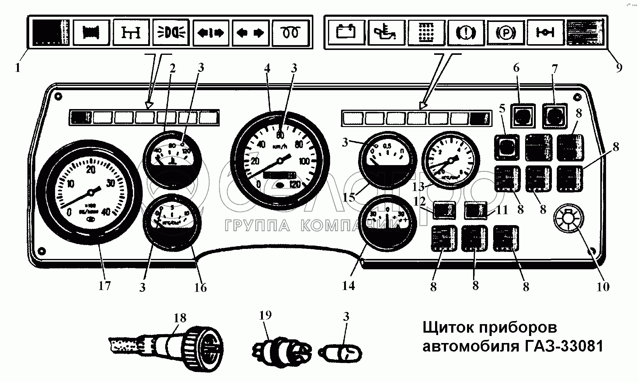 Каталог запасных частей к технике: ГАЗ-3308. Щиток приборов автомобиля ГАЗ-33081