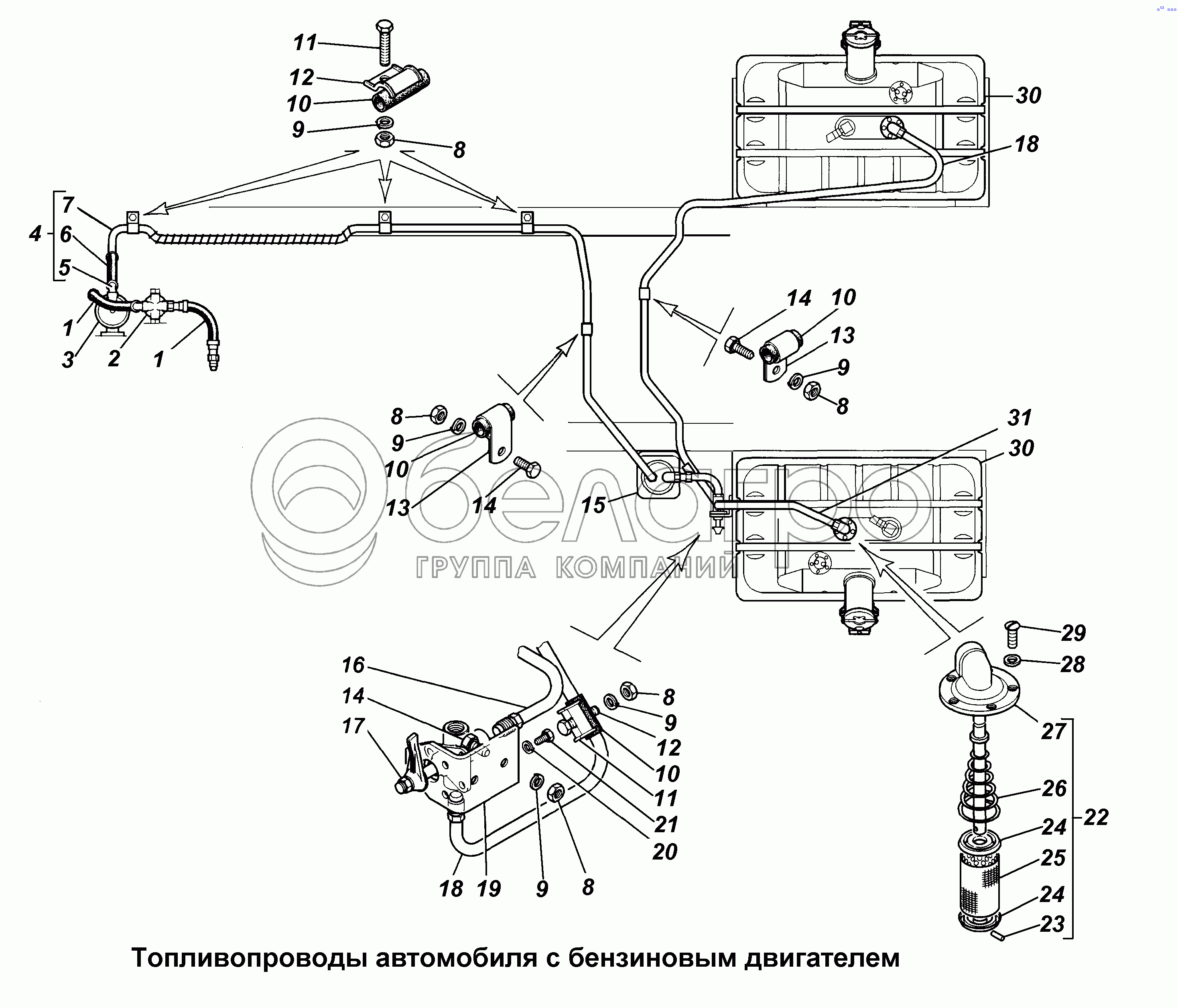 Каталог запасных частей к технике: ГАЗ-3308. Топливопроводы автомобиля с бензиновым двигателем