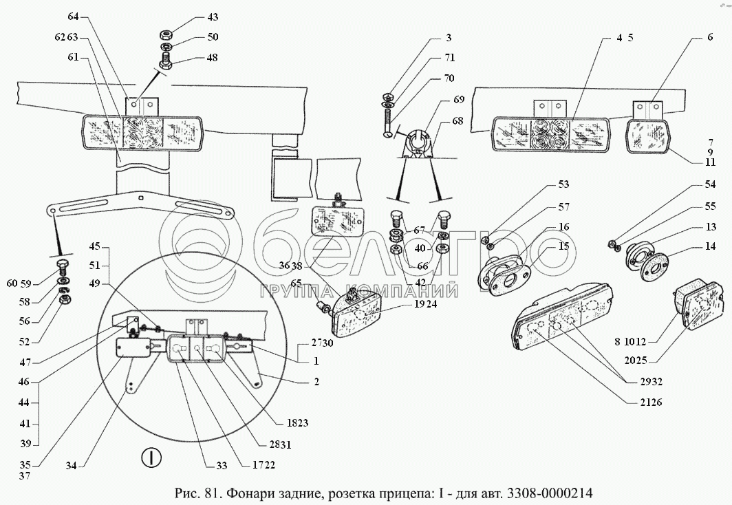 Каталог запасных частей к технике: ГАЗ-3308. Фонари задние, розетка прицепа