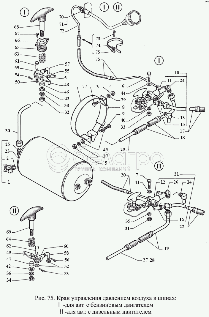 Каталог запасных частей к технике: ГАЗ-3308. Кран управления давлением воздуха в шинах
