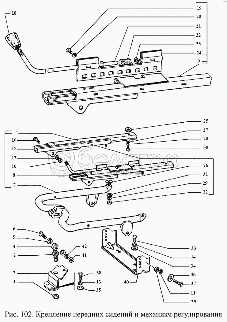 Каталог запасных частей к технике: ГАЗ-3308. Крепление передних сидений и механизм регулирования