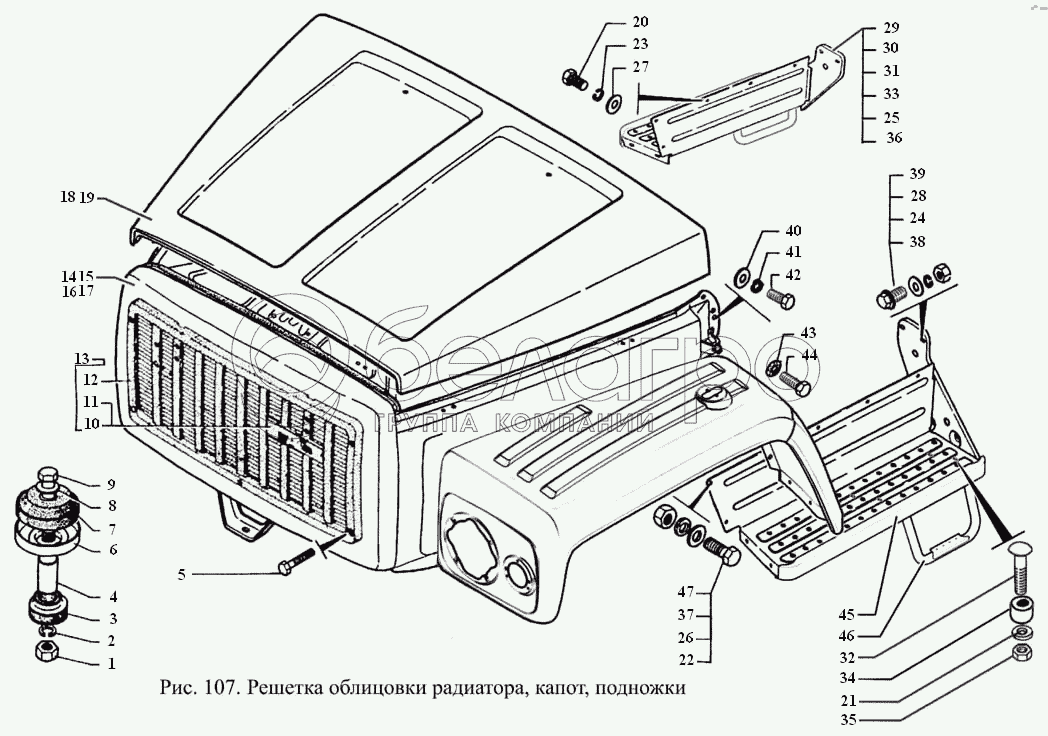 Каталог запасных частей к технике: ГАЗ-3308. Решетка облицовки радиатора, капот, подножки