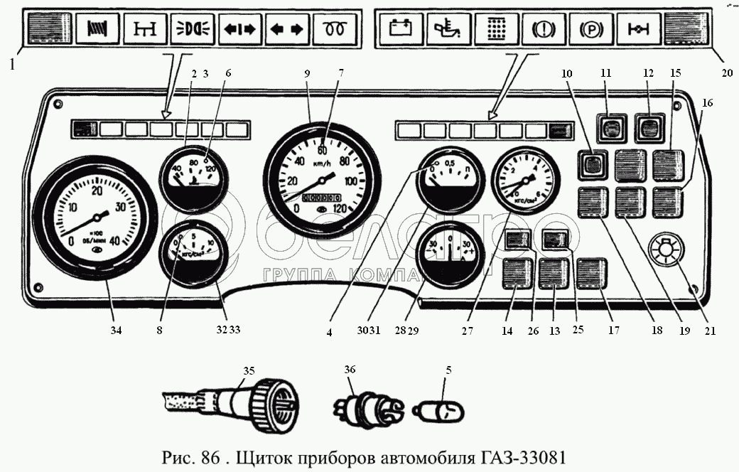 Каталог запасных частей к технике: ГАЗ-3308. Щиток приборов автомобиля ГАЗ-33081