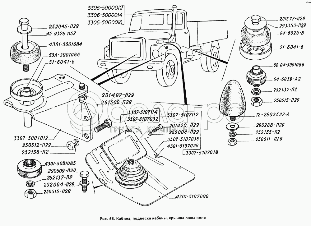 Каталог запасных частей к технике: ГАЗ-3309. Кабина, подвеска кабины, крышка люка пола