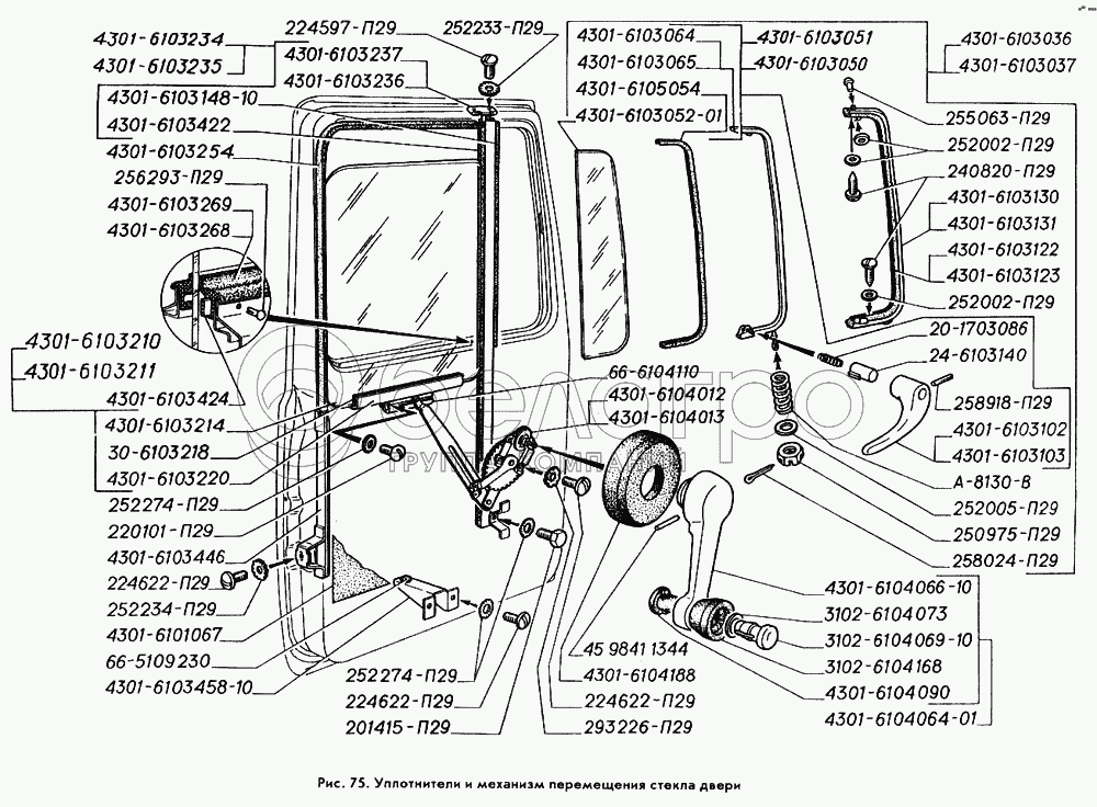 Каталог запасных частей к технике: ГАЗ-3309. Уплотнители и механизм перемещения стекла двери