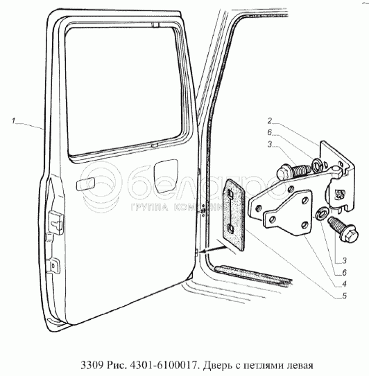Каталог запасных частей к технике: ГАЗ-3309 (Евро 2). Дверь с петлями левая
