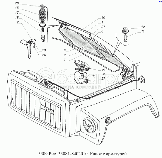 Каталог запасных частей к технике: ГАЗ-3309 (Евро 2). Капот с арматурой
