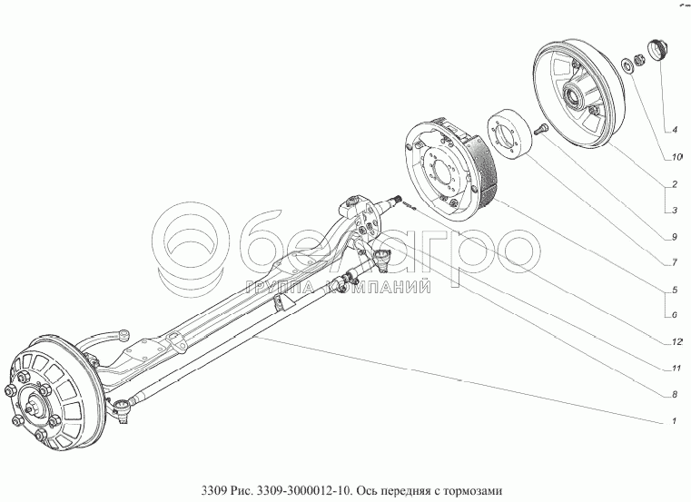 Каталог запасных частей к технике: ГАЗ-3309 (Евро 2). Ось передняя с тормозами