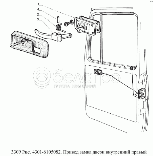 Каталог запасных частей к технике: ГАЗ-3309 (Евро 2). Привод замка двери внутренний правый