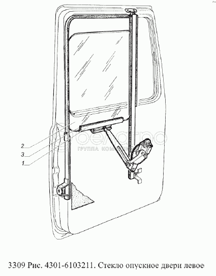 Каталог запасных частей к технике: ГАЗ-3309 (Евро 2). Стекло опускное двери левое