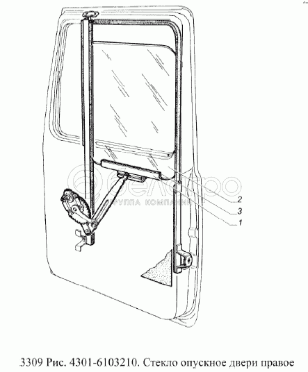 Каталог запасных частей к технике: ГАЗ-3309 (Евро 2). Стекло опускное двери правое