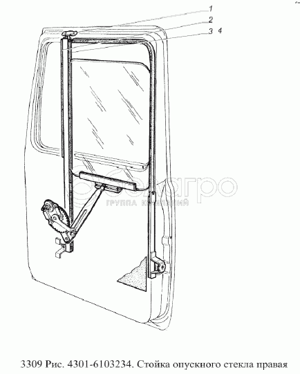 Каталог запасных частей к технике: ГАЗ-3309 (Евро 2). Стойка опускного стекла правая