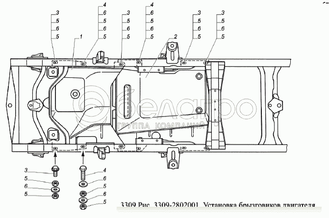 Каталог запасных частей к технике: ГАЗ-3309 (Евро 2). Установка брызговиков двигателя