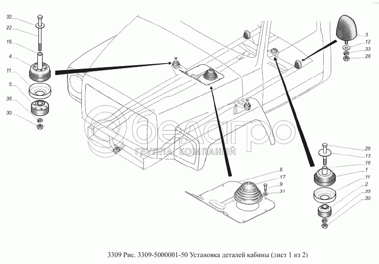 Каталог запасных частей к технике: ГАЗ-3309 (Евро 2). Установка деталей кабины