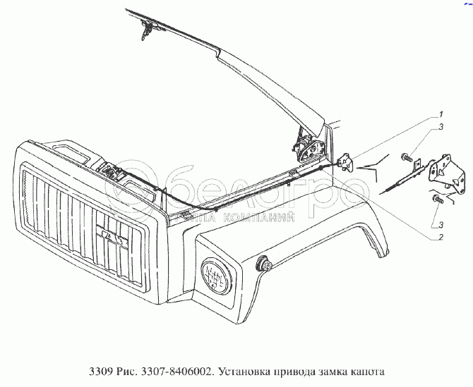 Каталог запасных частей к технике: ГАЗ-3309 (Евро 2). Установка привода замка капота