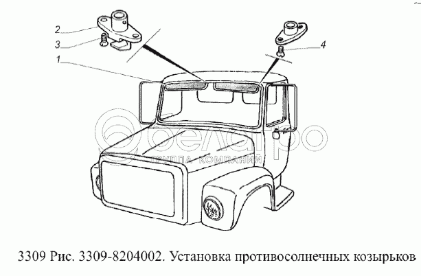 Каталог запасных частей к технике: ГАЗ-3309 (Евро 2). Установка противосолнечных козырьков