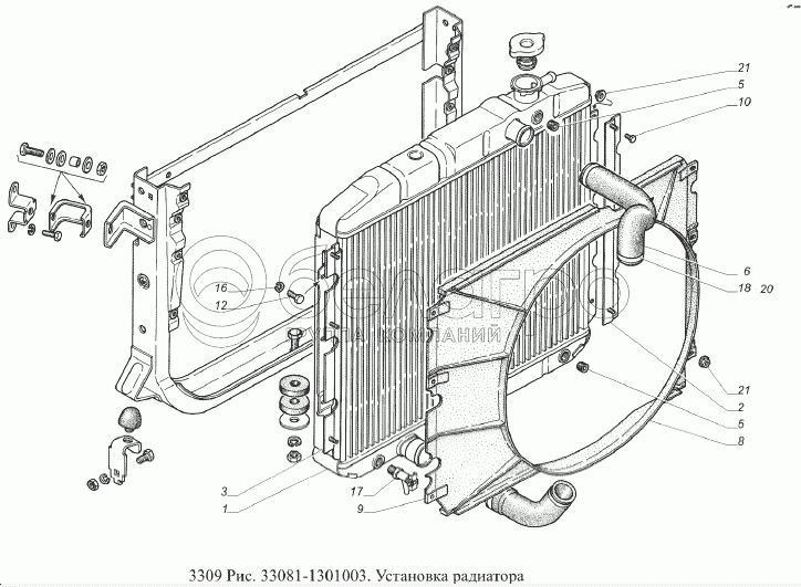 Каталог запасных частей к технике: ГАЗ-3309 (Евро 2). Установка радиатора