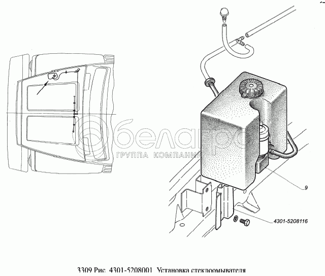 Каталог запасных частей к технике: ГАЗ-3309 (Евро 2). Установка стеклоомывателя
