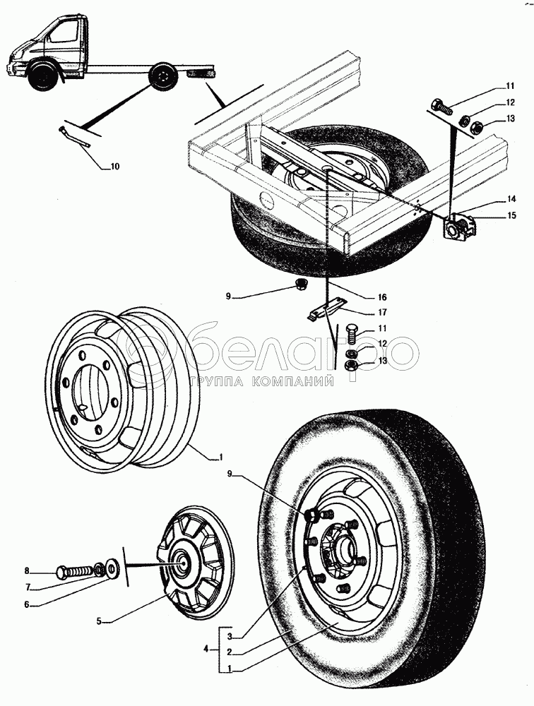 Каталог запасных частей к технике: ГАЗ-33104 Валдай. Установка колес, установка держателя запасного колеса