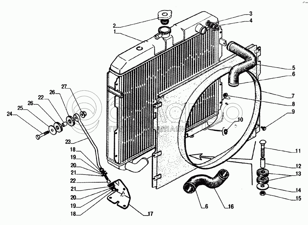 Каталог запасных частей к технике: ГАЗ-33104 Валдай. Установка системы охлаждения, радиатор