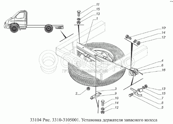 Каталог запасных частей к технике: ГАЗ-33104 Валдай Евро 3. Установка держателя запасного колеса