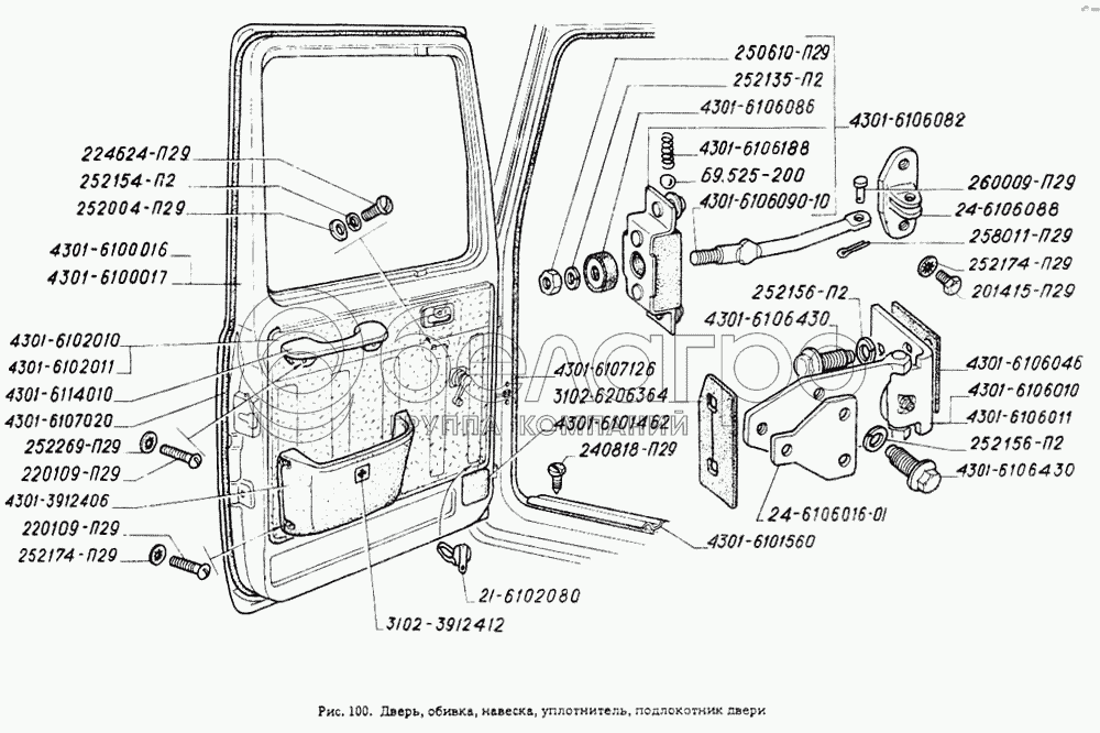Каталог запасных частей к технике: ГАЗ-4301. Дверь, обивка, навеска, уплотнитель, подлокотник двери