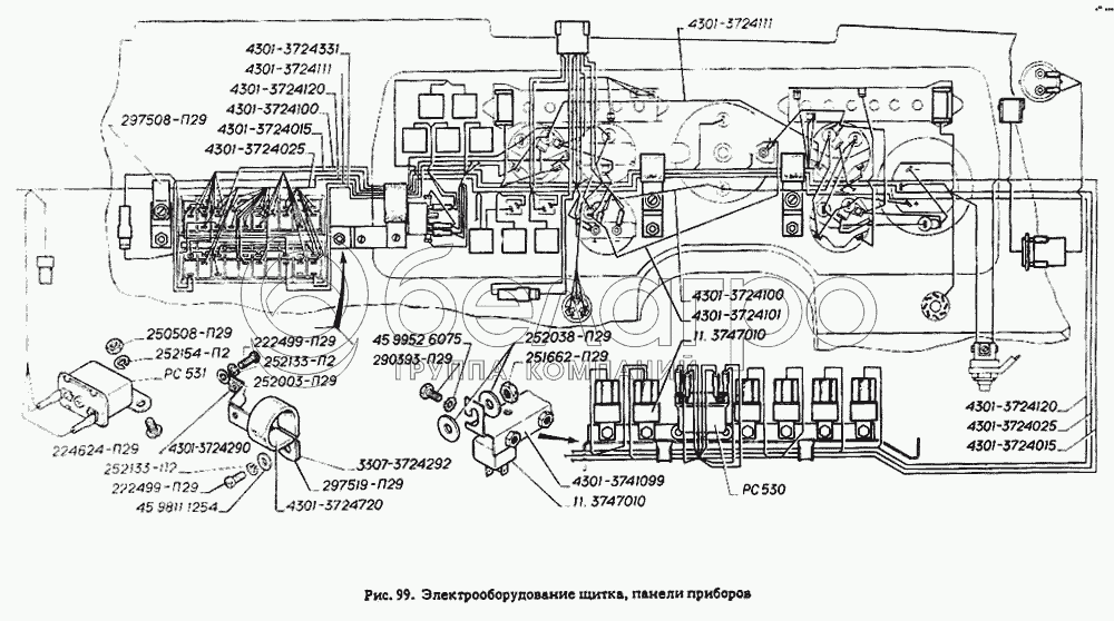 Каталог запасных частей к технике: ГАЗ-4301. Электрооборудование щитка, панели приборов