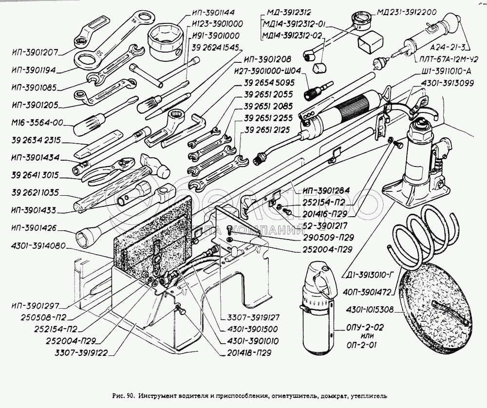 Каталог запасных частей к технике: ГАЗ-4301. Инструмент водителя и приспособления, огнетушитель, домкрат, утеплитель