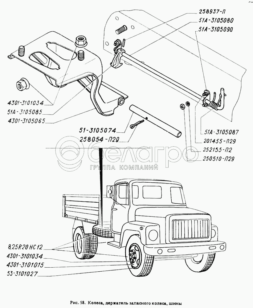 Каталог запасных частей к технике: ГАЗ-4301. Колеса, держатель запасного колеса, шины
