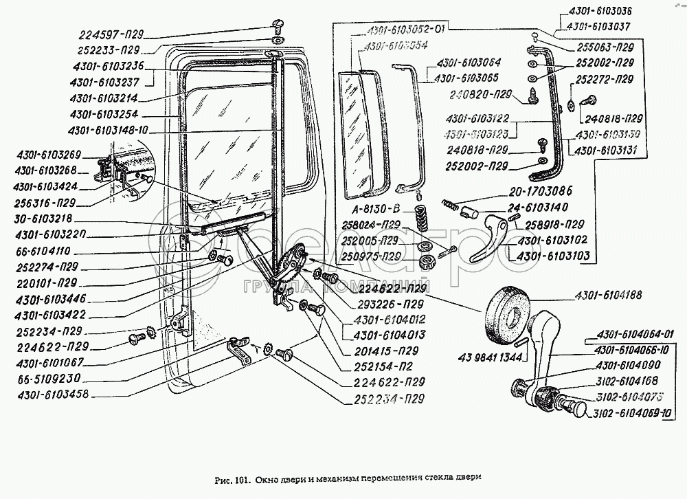 Каталог запасных частей к технике: ГАЗ-4301. Окно двери и механизм перемещения стекла двери