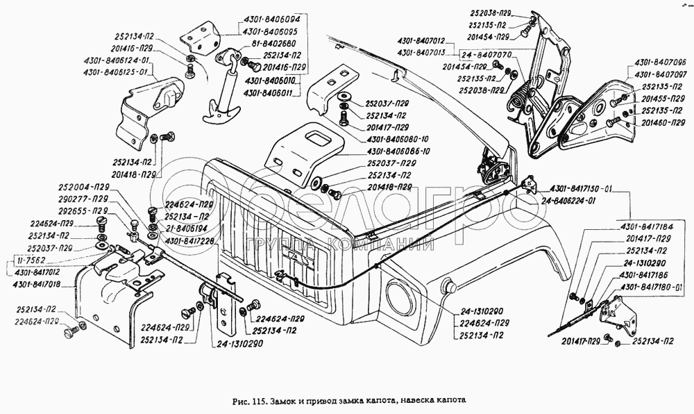 Каталог запасных частей к технике: ГАЗ-4301. Замок и привод замка капота, навеска капота